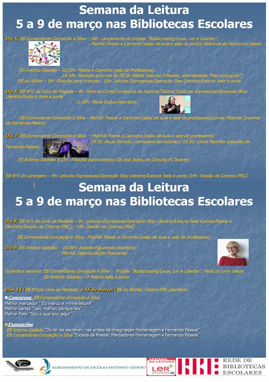 Tivemos; Poesia a caminho, dita por alunos estrangeiros; O Poema bate à porta em diversos locais da escola; Uma exposição Do ler ao escrever: nas ondas da Imaginação – Homenagem a Fernando Pessoa com trabalhos e visitas dos alunos dos diferentes Ciclos do Agrupamento; Filosofia com Os dois lados; Um encontro com a escritora Isabela Figueiredo que apresentou  os seus livros A Gorda e Caderno de Memórias Coloniais tendo proporcionado aos presentes uma manhã de reflexão; Finalmente a semana terminou com uma sessão dinamizada na Biblioteca Municipal José Saramago com a Cristina Taquelim e as Histórias da mulher que lia.